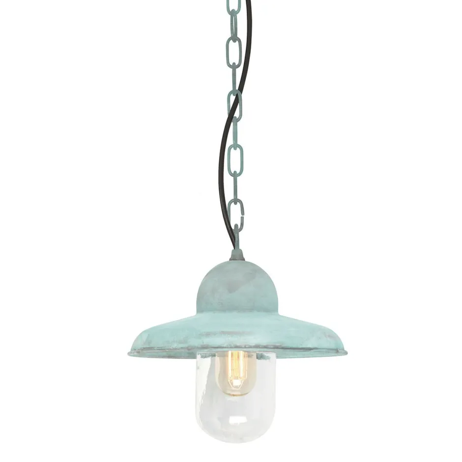 Der Lampenschirm der Pendelleuchte ist einer antiken Schiffslampe nachempfunden und versprüht Hafen-Flair