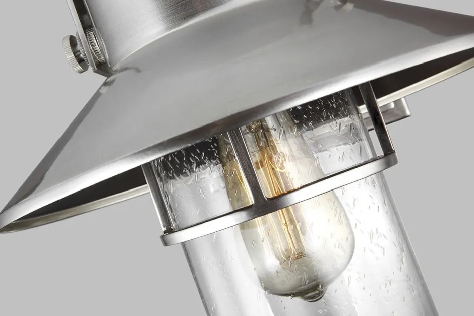 Die robuste Wandleuchte vereint Elemente des Industrial Designs mit einer klassisch-nautischen Form, was aus der Außenlampe einen absoluten Blickfang macht