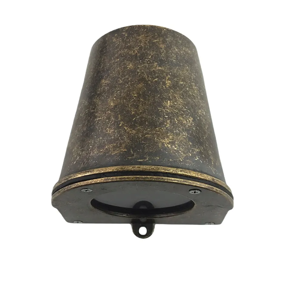 Schmale Outdoor Wandleuchte aus massivem Messing und Glas in verwittertem Messing im nostalgischen Vintage Design für Garten, Terrasse, Balkon, Haus und Hof