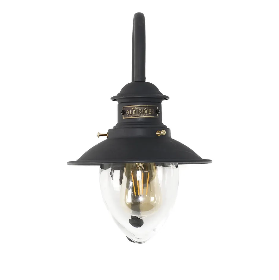 Detailreiche Schirmgestaltung in antiker Optik, mit hochwertigen Zierschrauben und dekorativem Schild. Die stiltypische Erscheinung wird komplettiert durch den originell geformten Glasschirm, der zudem das Leuchtmittel vor der Witterung schützt.
