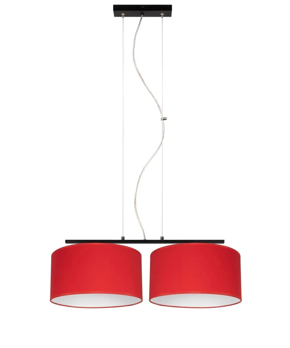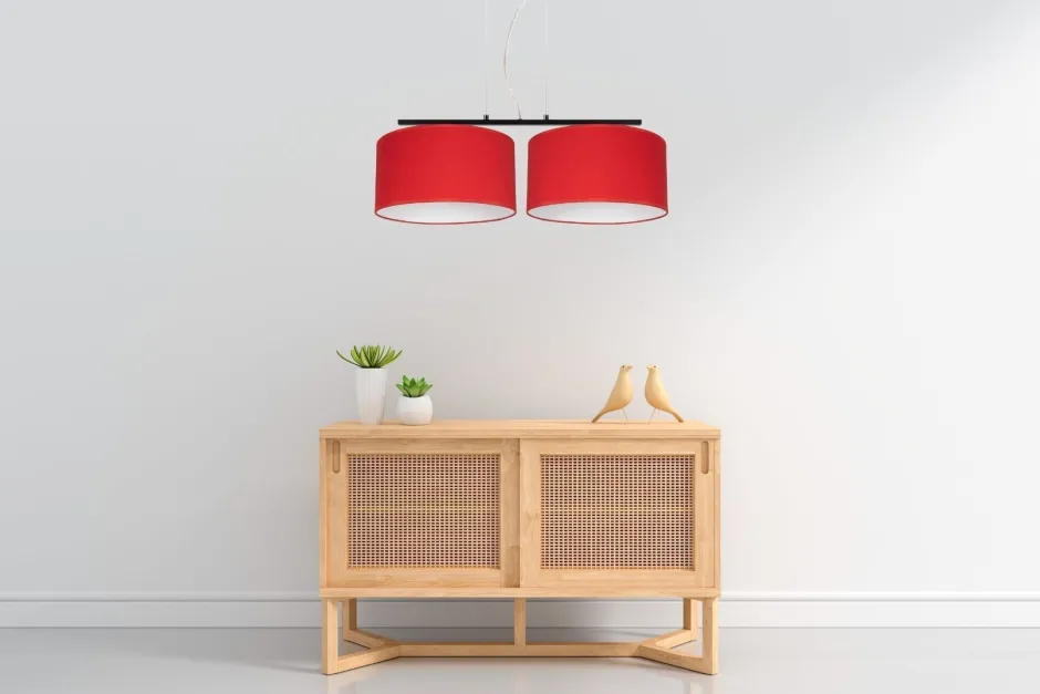 Die roten Stoffschirme sind dekorativ und streuen das Licht diffus und blendarm in den Raum