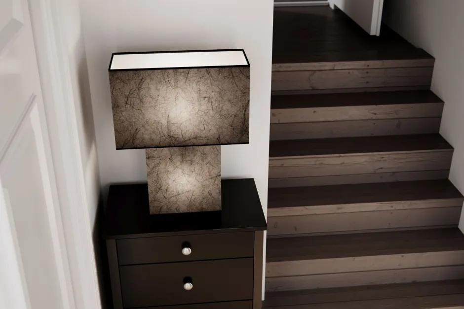 Das besondere Material bildet nicht nur den Lampenschirm, sondern umschließt auch den Sockel – ein außergewöhnlicher Blickfang für Schlafzimmer und Wohnzimmer