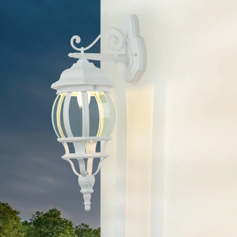 Die Außenlampe setzt dank der geschwungenen Details elegante Akzente und ist ein dekoratives Highlight für Eingangsbereich, Balkon oder Terrasse
