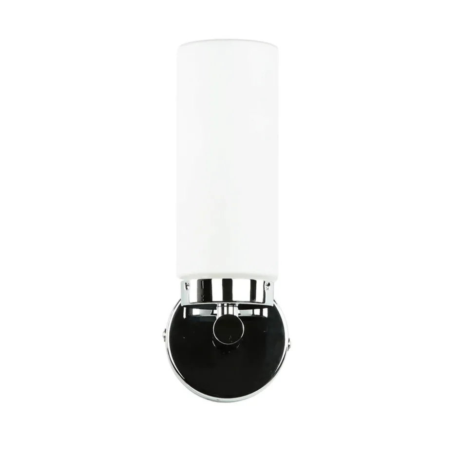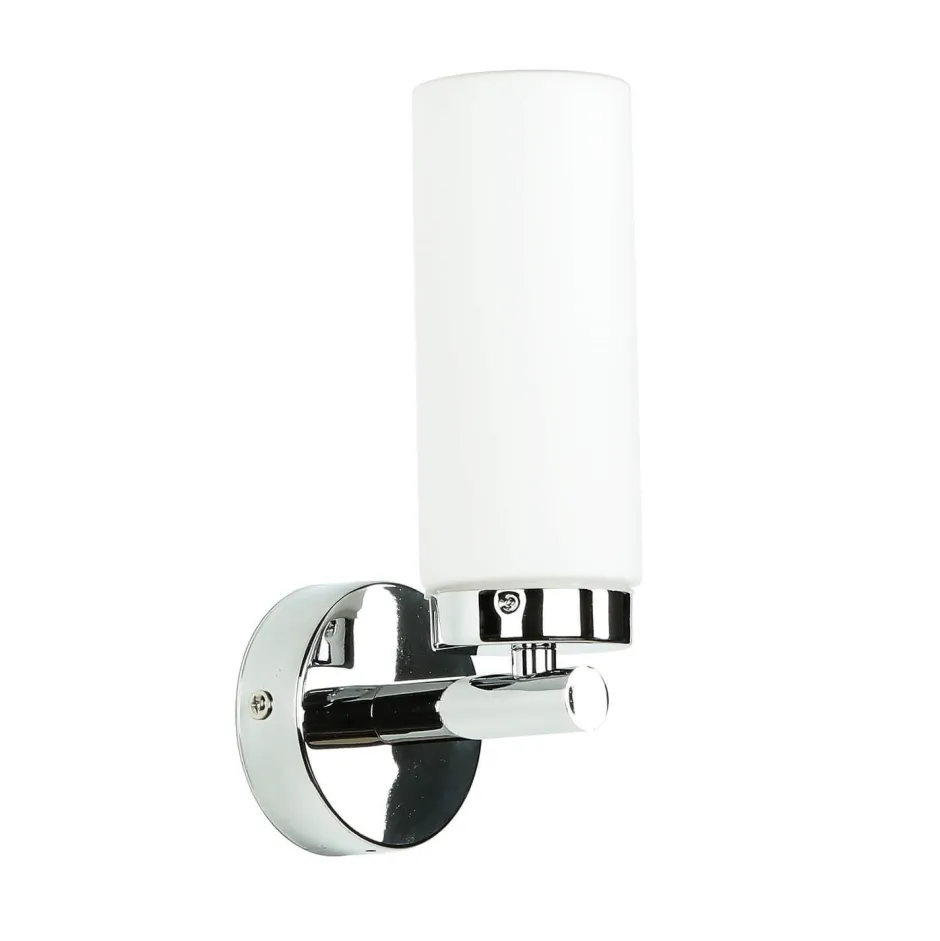 Die klassischen Farben Weiß und Chrom machen die kleine Wandleuchte zu einem vielseitigen Lichtspender neben jedem Spiegel