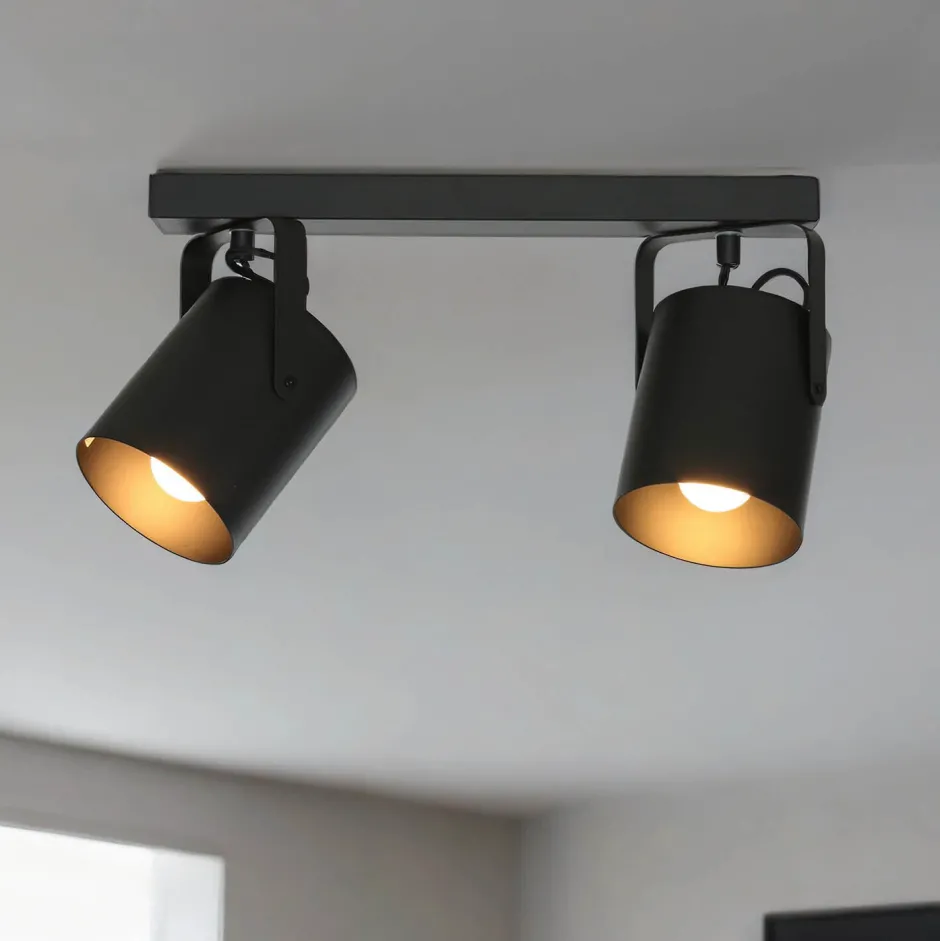 Bringe stilvolles, flexibles Licht in Dein Zuhause mit diesem modernen 2-flammigen Deckenstrahler in Schwarz. Aus robustem, lackiertem Stahl gefertigt, überzeugt die Spotleuchte nicht nur durch hochwertige Verarbeitung, sondern auch durch ihr zeitloses, kompaktes Design. Die beiden dreh- und schwenkbaren Spotköpfe lassen sich individuell ausrichten – perfekt, um gezielt Lichtakzente auf Möbel, Bilder oder Arbeitsbereiche zu setzen. Mit einer Länge von nur 38 cm eignet sich der Strahler hervorragend für kleinere Räume oder niedrige Decken. Dank der zwei E27–Fassungen bist du bei der Wahl der Leuchtmittel völlig flexibel – Du bestimmst Lichtfarbe und Helligkeit selbst (Leuchtmittel nicht enthalten, max. 60 W je Fassung). Ideal als Deckenleuchte in Küche, Flur, Schlafzimmer oder Büro – dieser Strahler kombiniert Funktionalität mit elegantem Stil und sorgt für ein wohnliches, individuell angepasstes Lichtkonzept.