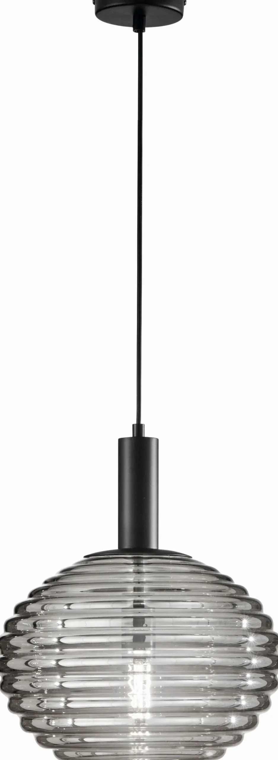 Geriffelter Glasschirm in Rauchgrau für ein stilvolles und elegantes Statement über dem Esstisch in Wohnzimmer und Esszimmer