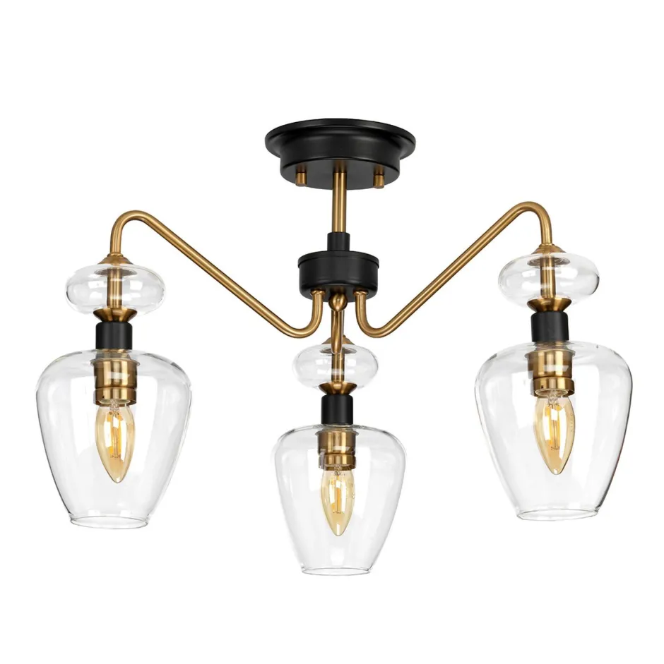 Die gebogenen Arme und die bauchigen Lampenschirme verleihen der Deckenlampe einen eleganten Look, was durch die edlen Farben weiter betont wird