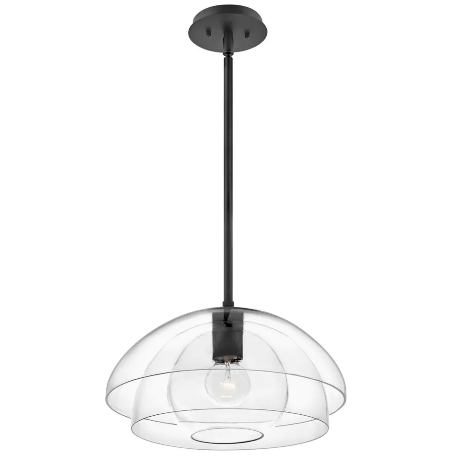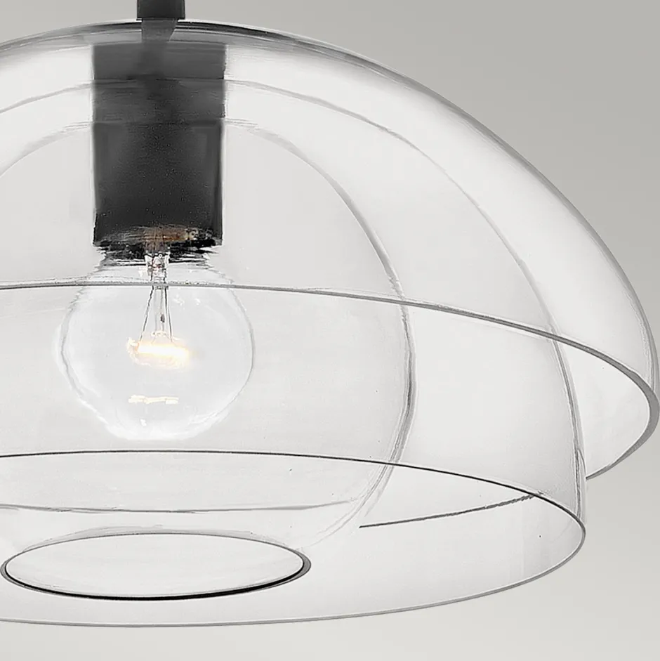 Eine offene und eine fast geschlossene Schale umhüllen den inneren Kugelschirm, was der Hängelampe einen außergewöhnlichen Look verleiht