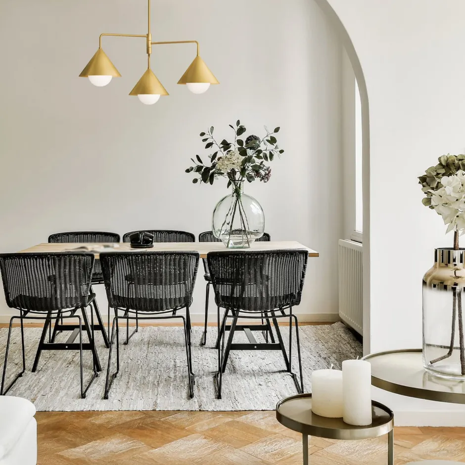 Die Hängeleuchte ist dank austauschbarer Stangen in der Höhe verstellbar – ideal über dem Esstisch