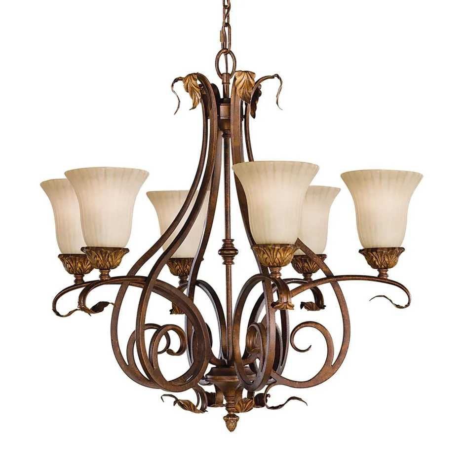 Auf geschwungenen Armen thronen 6 geriffelte Glas Schirme, welche durch ihre dezente Farbe für ein blendarmes und angenehmes Licht sorgen