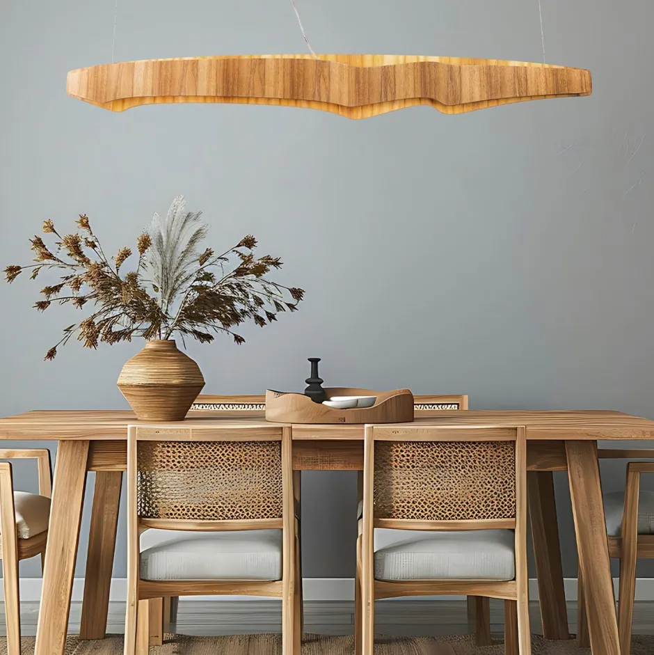 Das pflegeleichte und robuste Material mit seiner natürlichen Maserung und Farbe verleiht der Hängeleuchte einen wohnlichen Charakter, der sich leicht mit vielen Einrichtungsstilen kombinieren lässt