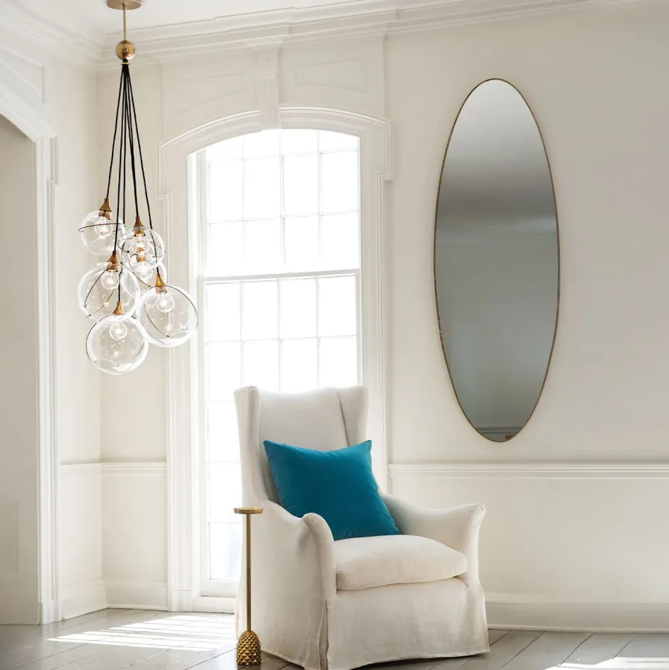 Der Kugelschirm wird von dem schmalen Metallbügel schräg gehalten, sodass die Öffnung nicht mittig nach unten zeigt – ein außergewöhnlicher Blickfang in Wohnzimmer, Esszimmer und Küche