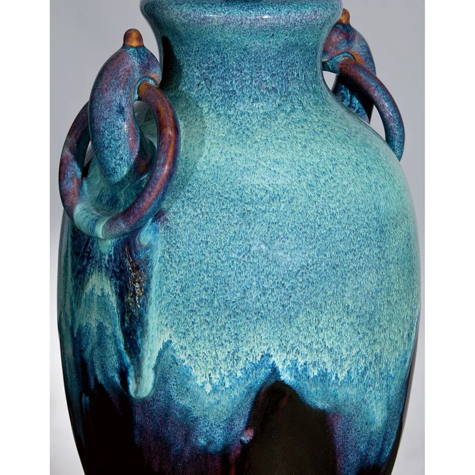 Jede Säule ist dank der reaktiven Glasur ein individuell gefärbtes Meisterwerk in Blau und Türkis.