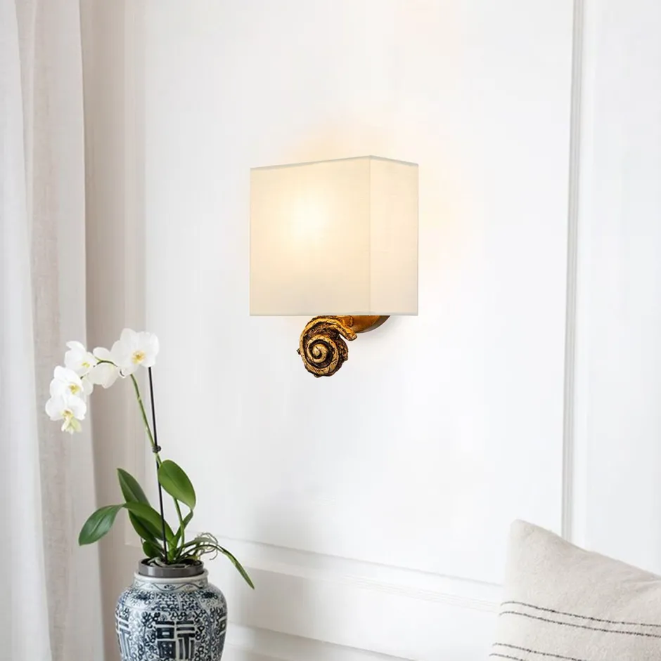 Schmale Wandlampe mit Stoffschirm und dekorativem Sockel