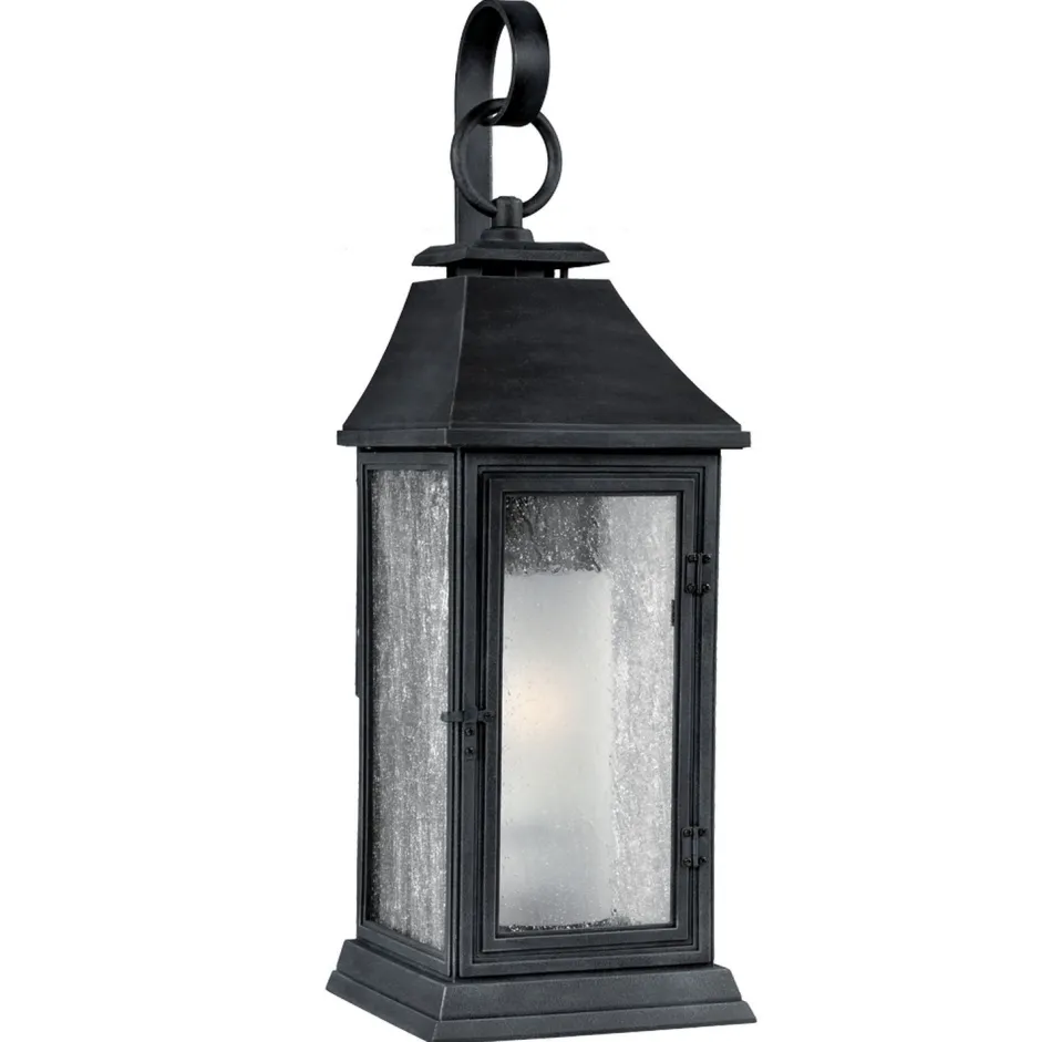 Die Laterne wurde in einem dunklen Zink in verwitterter Optik gehalten und setzt an jedem Eingang, Balkon und jeder Fassade dekorative Akzente
