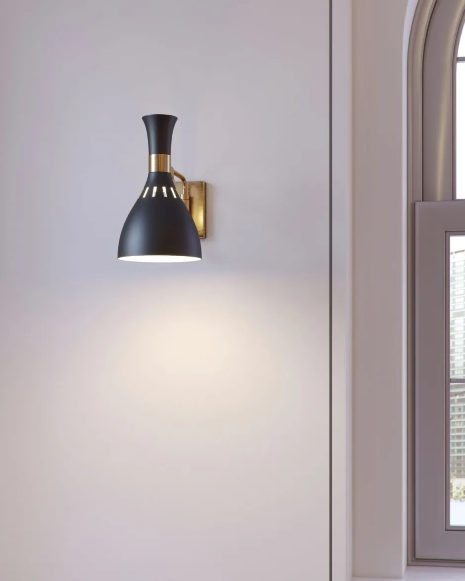 Die Kombination aus glänzendem Messing und mattem Schwarz sorgt für einen besonders stilvollen Look, was aus der Wandlampe einen dekorativen Blickfang macht
