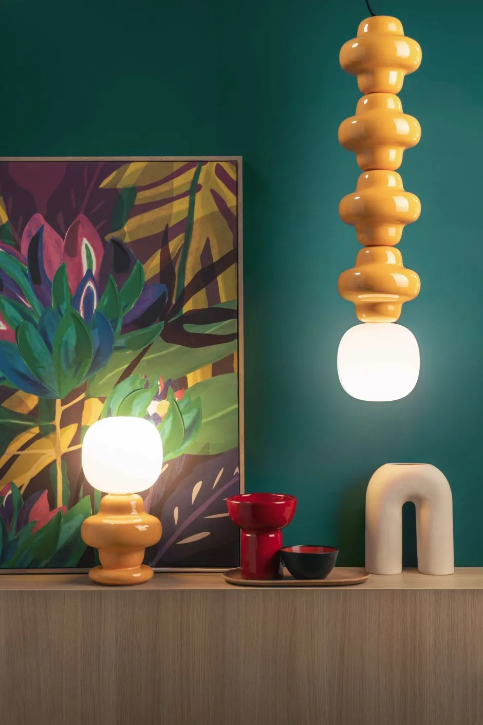 Die außergewöhnliche Form und das kräftige Gelb machen aus der Hängelampe einen absoluten Blickfang in Wohnzimmer, Esszimmer und Küche