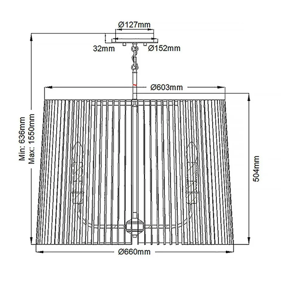 | Maße: | Breite: 660 mm | Hängetiefe: 636-1550 mm | Länge: 660 mm | Durchmesser: 660 mm | Höhe Schirm: 504 mm |