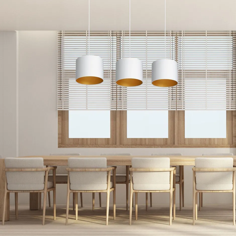 Zeitlose Pendelleuchte aus lackiertem Stahl, Stoff und Kunststoff in Weiß und Gold