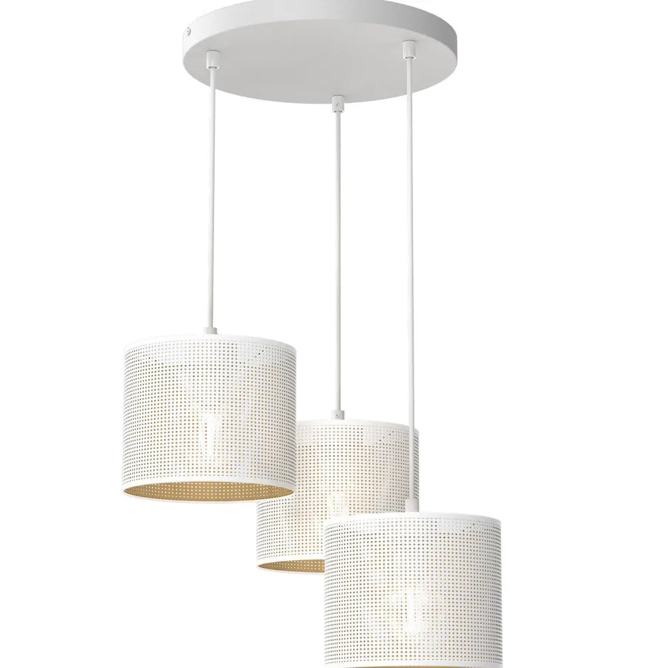Die Metallschirme mit winzigen Löchern und goldenen Innenseiten verleihen der Pendelleuchte einen dekorativen Charme