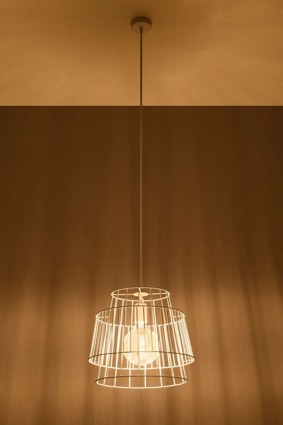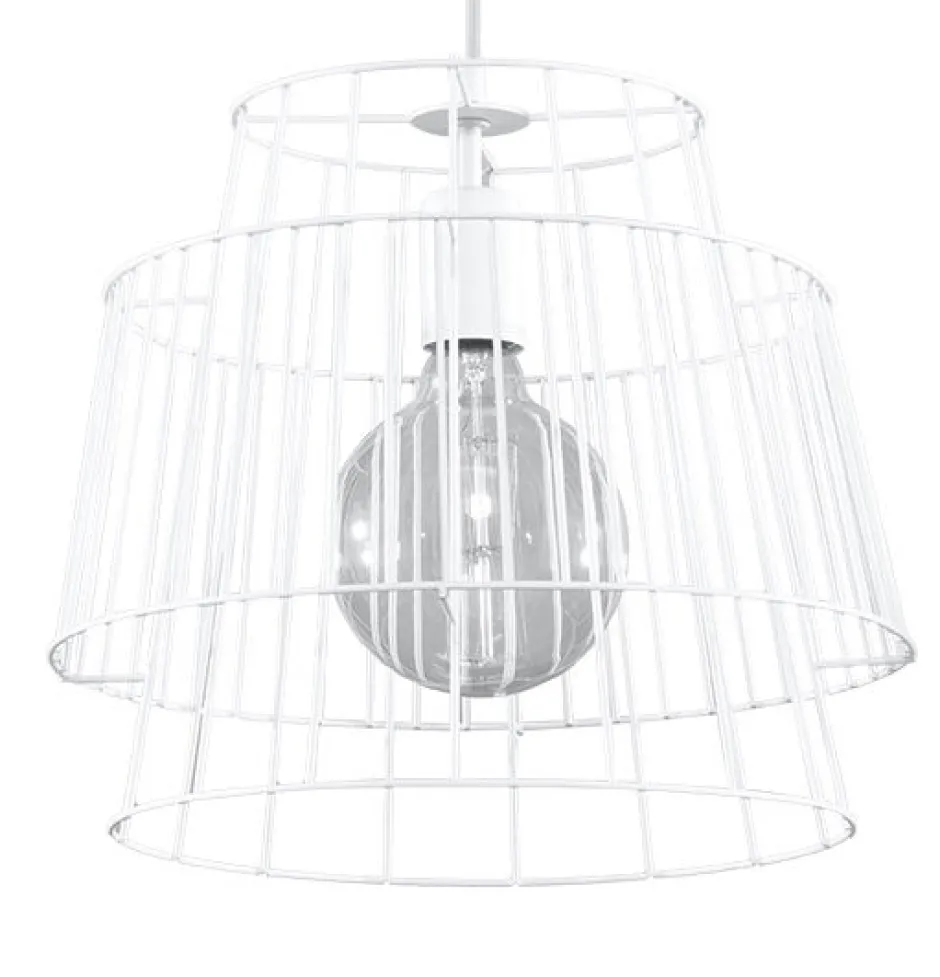 Der käfigartige Lampenschirm setzt das frei sichtbare Leuchtmittel besonders in Szene