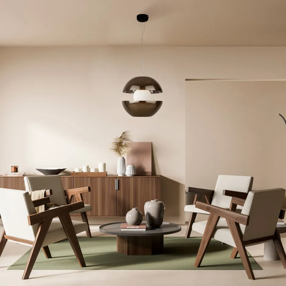 Kunstvolle LED Pendelleuchte mit außergewöhnlichem Doppelschirm