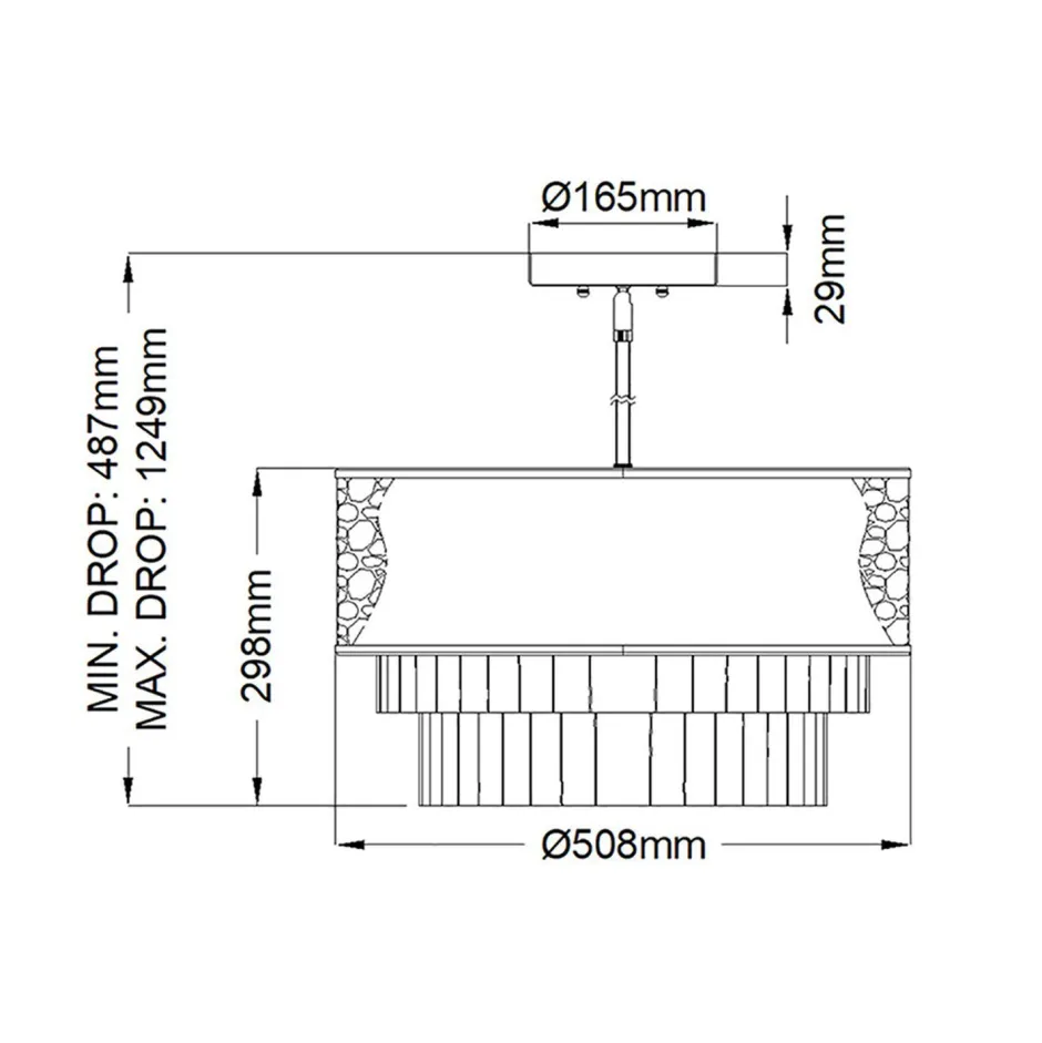 | Maße: | Breite: 508 mm | Hängetiefe: 487-1249 mm | Länge: 508 mm | Durchmesser: 508 mm | Höhe Schirm: 298 mm | Kabellänge: 305 mm |