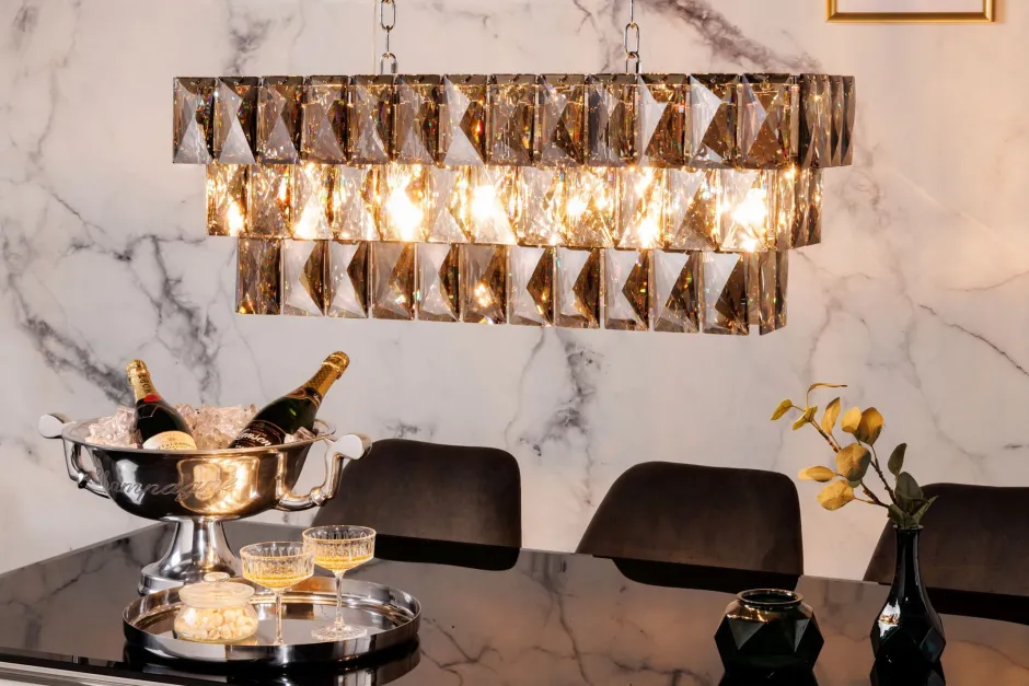 Die Kristall-Elemente der Pendelleuchte aus Glas wirken besonders elegant und prunkvoll – perfekt als Hingucker in Wohnzimmer und Esszimmer