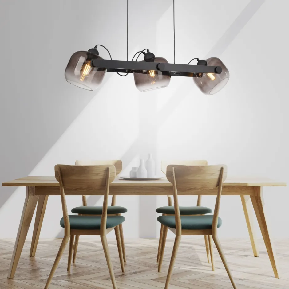 Die getönten Glasschirme streuen das Licht blendarm für ein wohnliches Ambiente in Wohnzimmer und Esszimmer über dem Esstisch