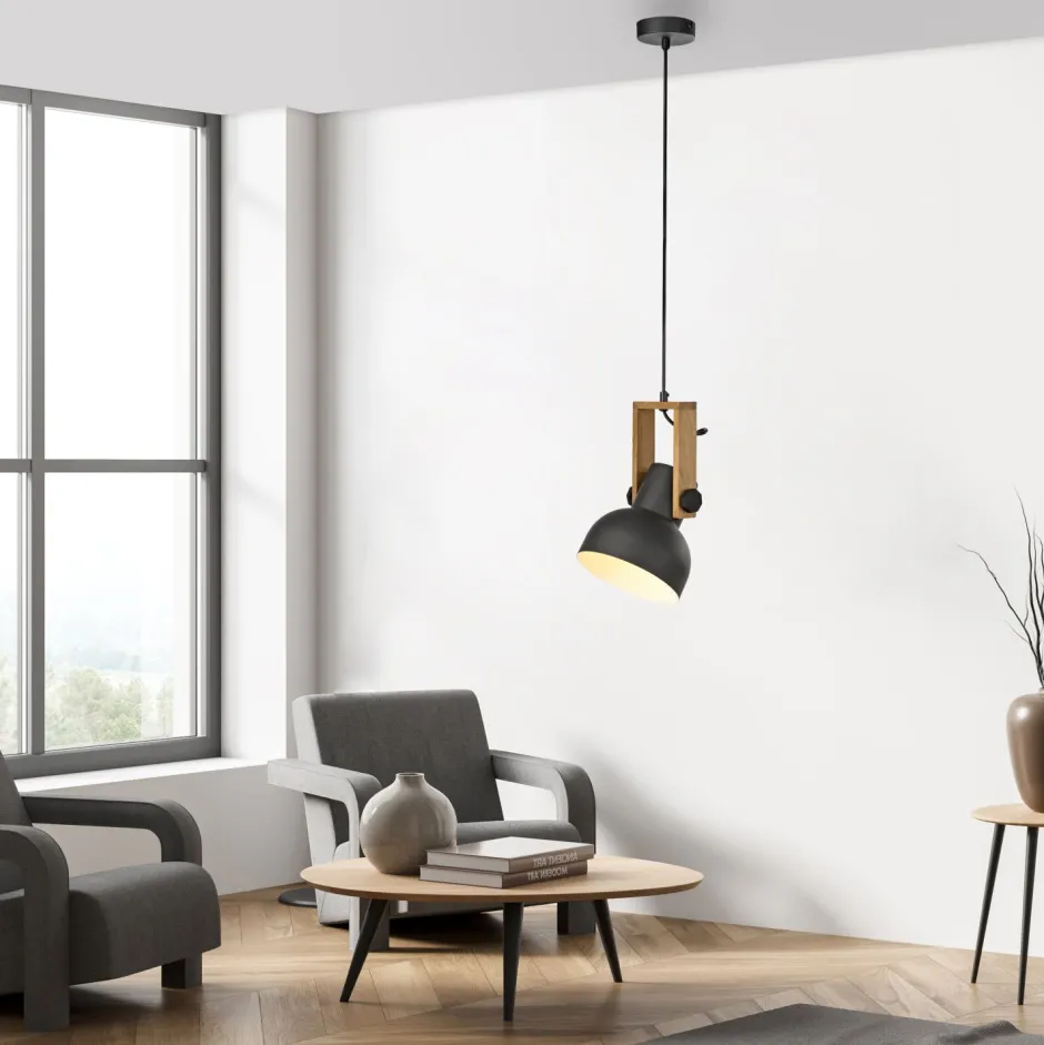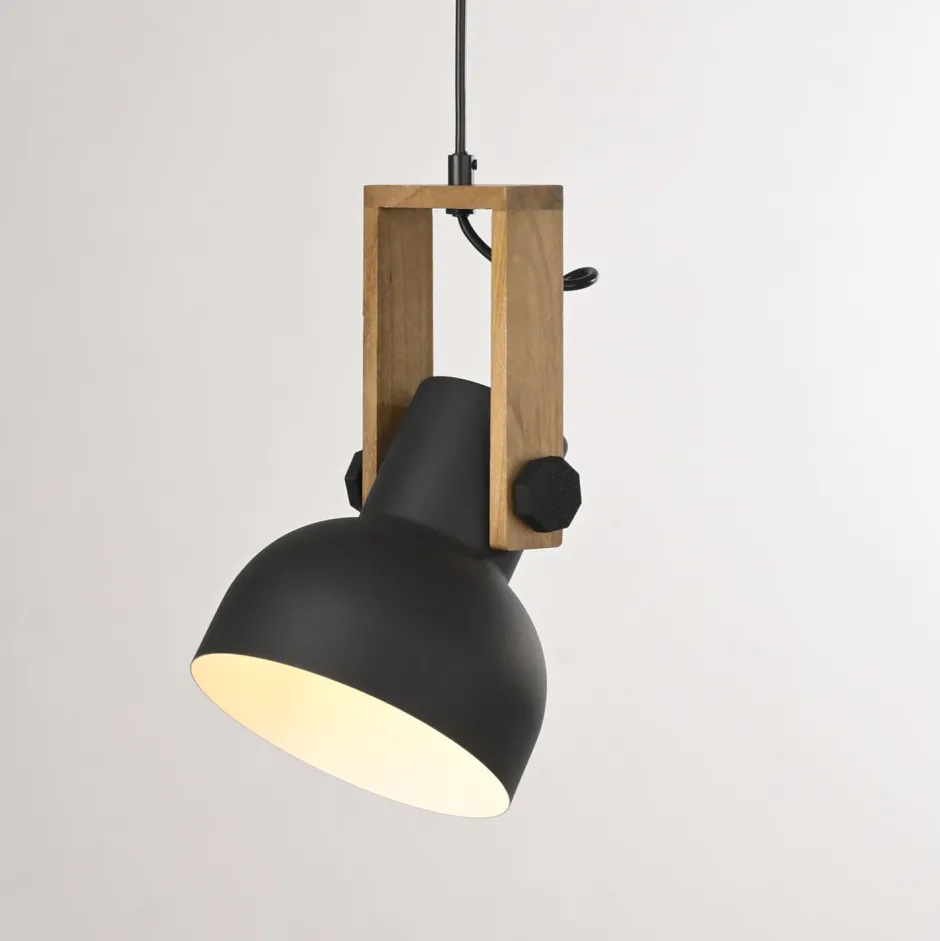 Industrie Hängelampe aus Metall und Holz in Schwarz