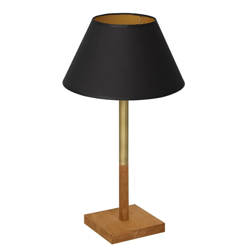 Moderne Tischlampe aus lackiertem Stahl, Holz und Stoff in Natur, Schwarz und gebürstetem Messing