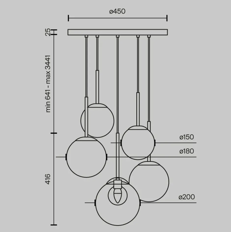 | Maße: | Breite: 580 mm | Hängetiefe: 641-3441 mm | Länge: 580 mm | Durchmesser: 580 mm | Durchmesser Sockel/Wandhalterung: 450 mm |