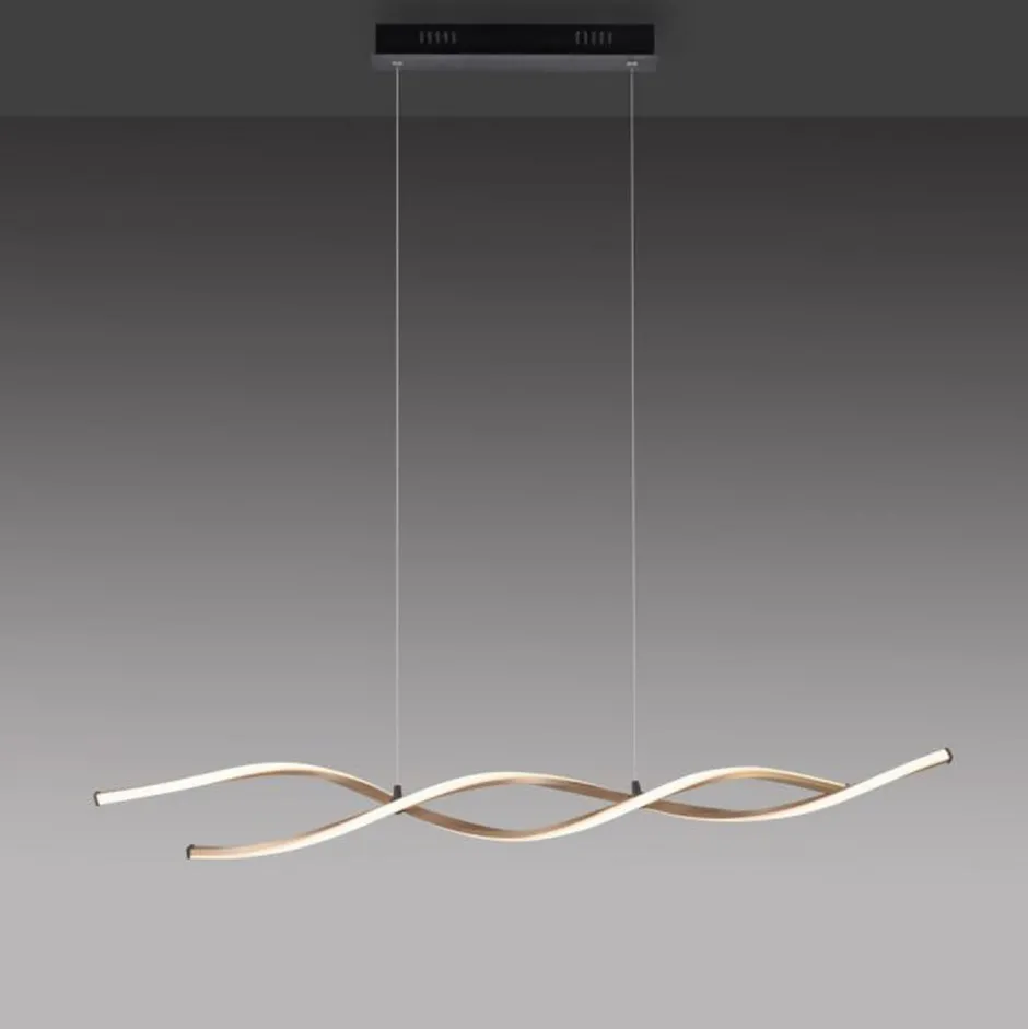 Das geschwungende, längliche Design der Hängelampe in edlem Gold fügt sich in jedes moderne Wohnambiente ideal ein und wird zum Blickfang über dem Esstisch