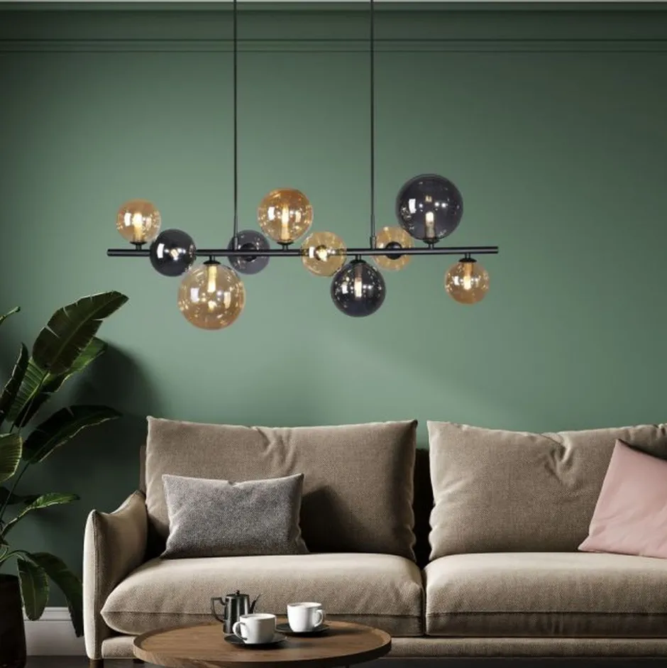 Die dekorativen Schirme aus Glas in Bernstein und Rauchgrau sind stilvoll und bringen blendarmes Licht in Dein Wohnzimmer und Esszimmer über dem Esstisch
