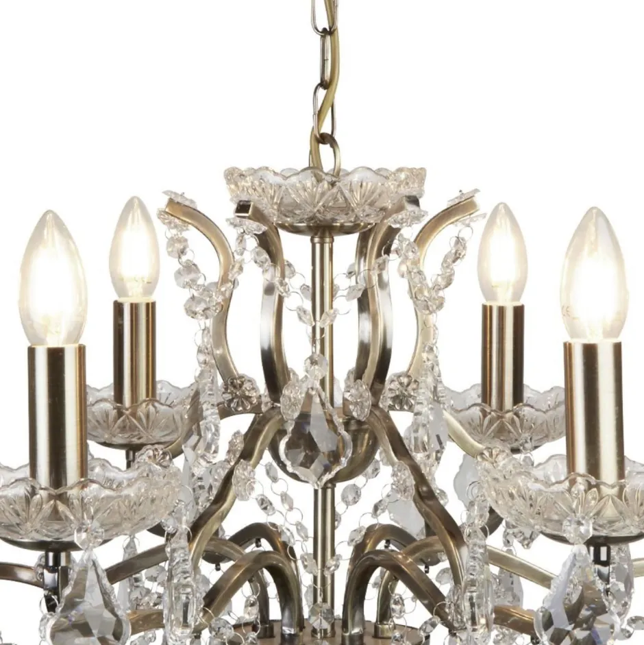 Der opulente Lüster besticht durch seine floralen Verzierungen und funkelnde Glaskristalle – ein dekoratives Highlight in jedem Schlafzimmer, Wohnzimmer und Esszimmer