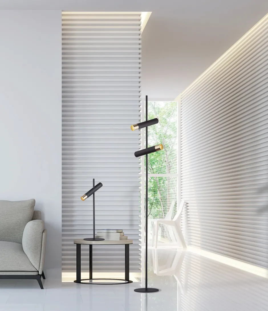 Kleine LED Stehleuchte mit verstellbaren Lampenschirmen