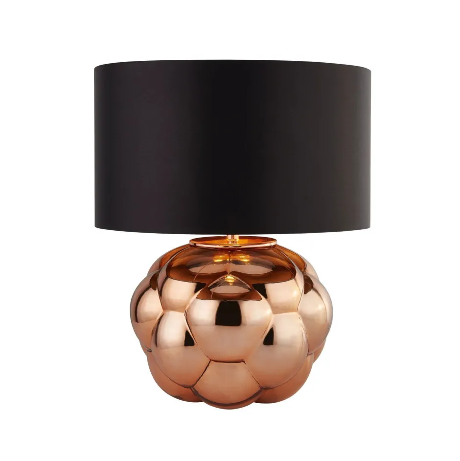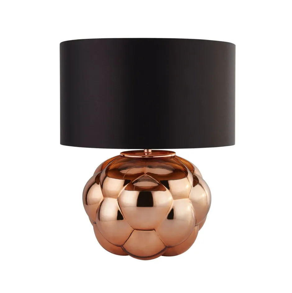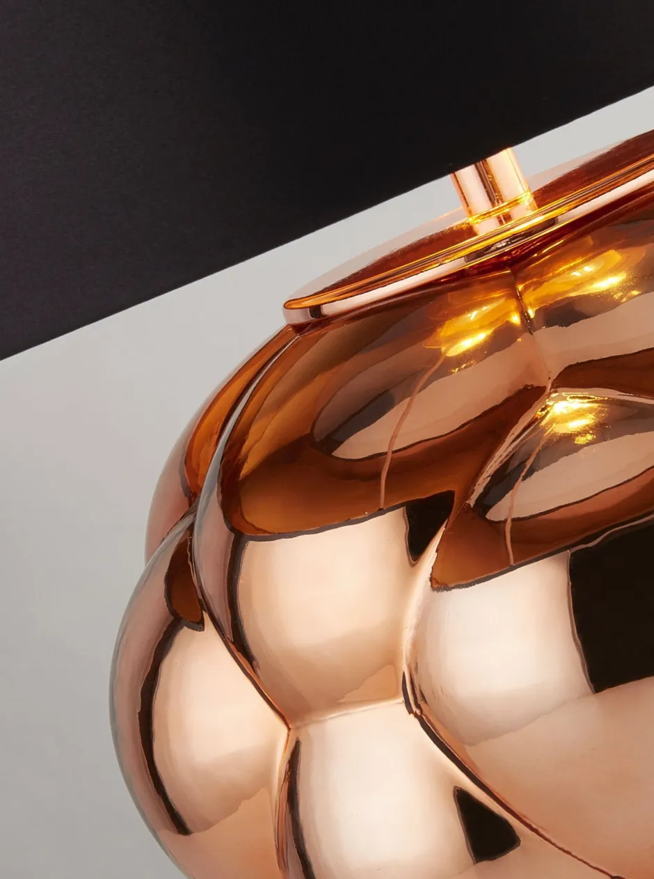 Das Glas in spiegelndem Kupfer setzt durch sein Blasen-Design ein dekoratives Statement und machen aus der Tischlampe einen absoluten Blickfang in Wohnzimmer und Schlafzimmer