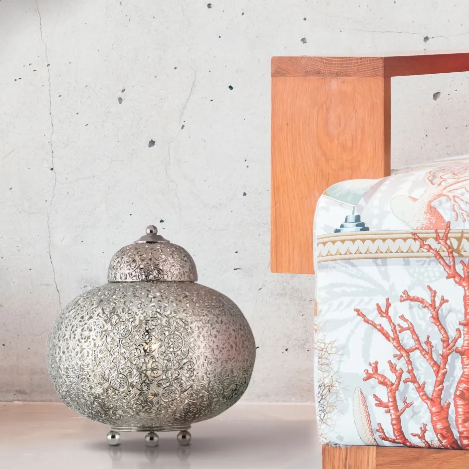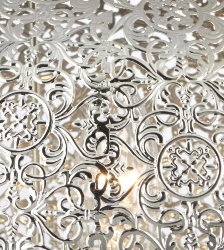 Der Metallschirm sorgt dank der Ornamente für ein besonderes Spiel aus Licht und Schatten, was durch klare Leuchtmittel weiter betont wird (nicht inkl.) – ein besonderer Blickfang in jedem Raum