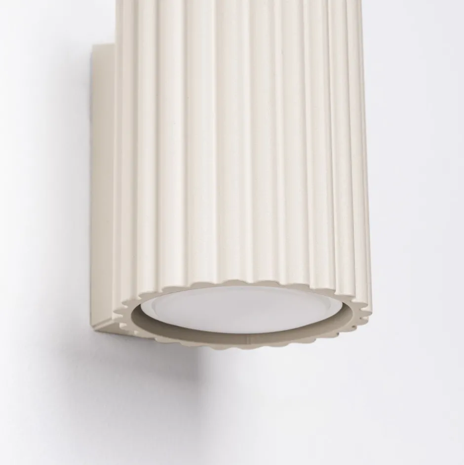 Kompakte Wandlampe aus Aluminium mit besonderem Lampenschirm in hellem Creme
