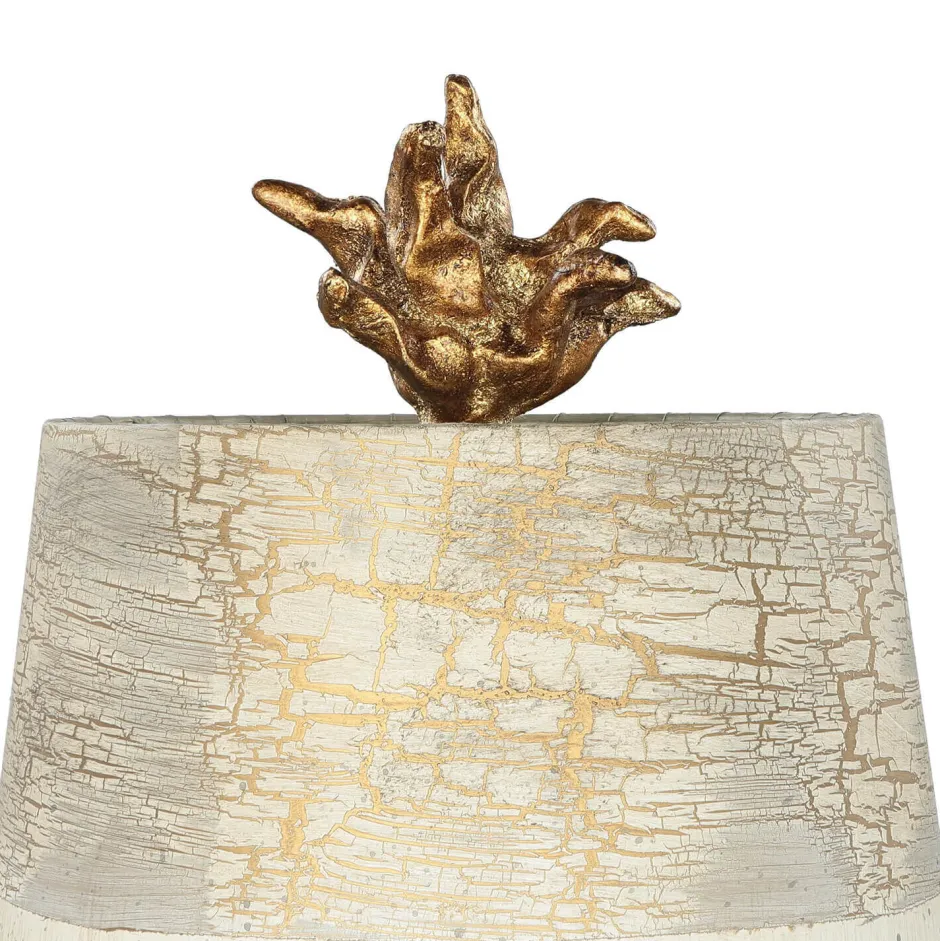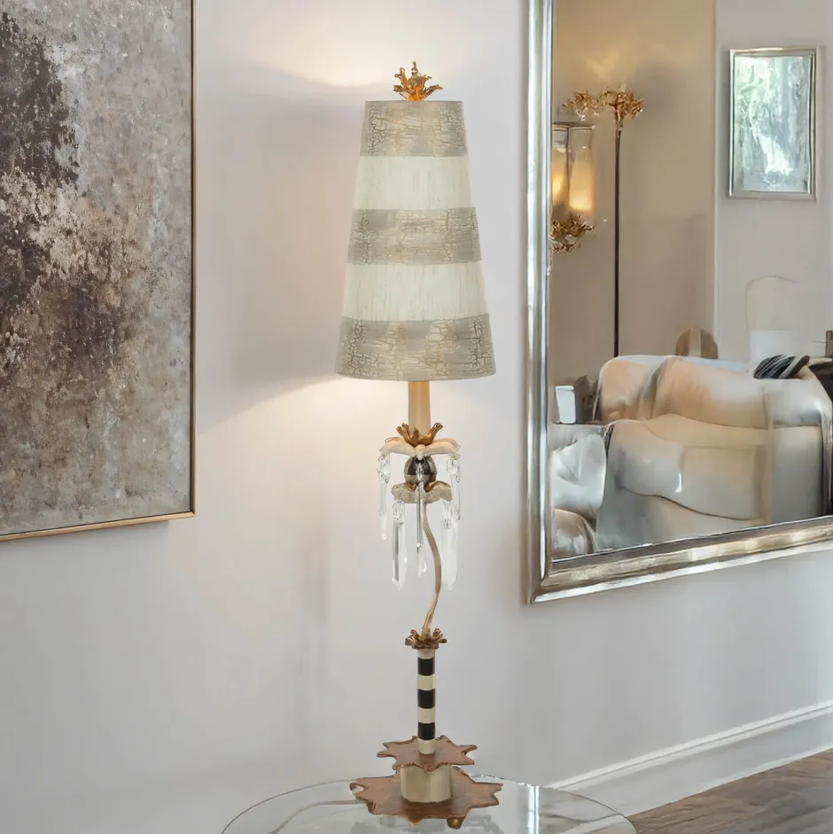Die Farben Creme, Taupe und Gold dominieren die niedrige Stehlampe und harmonieren mit vielen Wandfarben