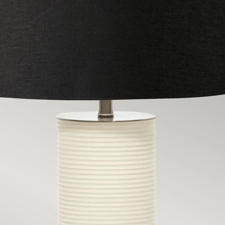 Der geradlinige Fuß mit seiner geriffelten Oberfläche verleiht der Tischlampe einen architektonischen Touch und macht sie in jedem Wohnzimmer, Schlafzimmer oder Büro zu einem dekorativen Blickfang