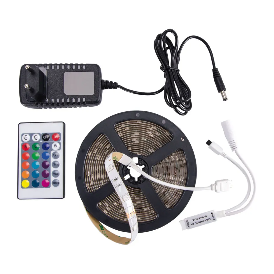 Dimmbarer LED Strip für buntes Licht (RGB Farbwechsel und Weiß): 5 Meter lang, 30 SMD LEDs pro 1 m, selbstklebend, schneidbar (alle 3 LEDs an vorgegebener Markierung), mit Steckdosenanschluss und Fernbedienung