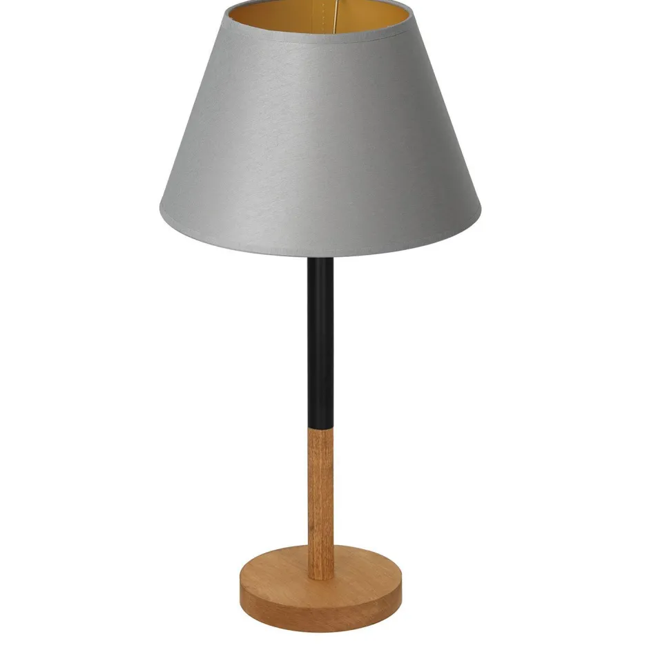 Moderne Tischleuchte aus lackiertem Stahl, Holz und Stoff in Natur, Schwarz und Grau