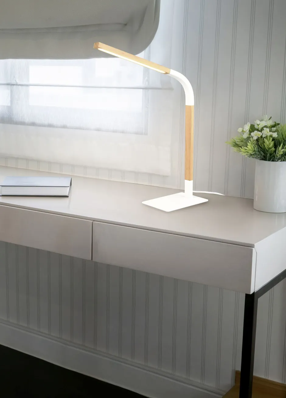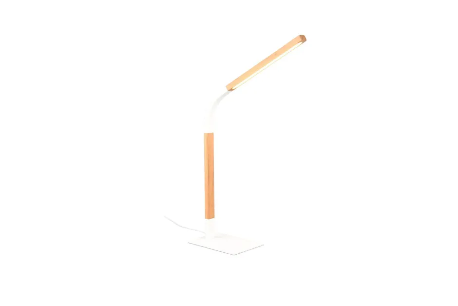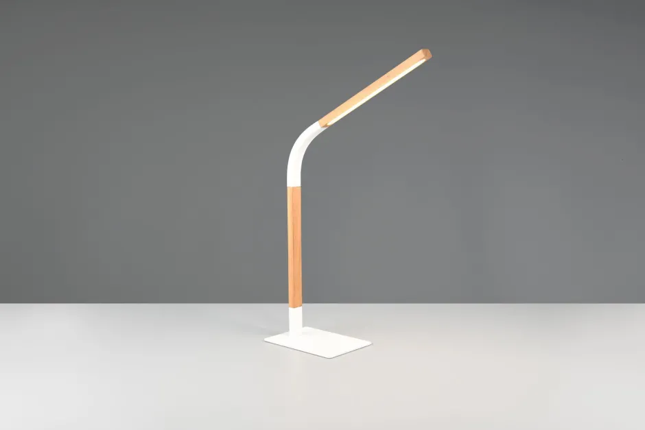 Skandinavische LED Tischlampe aus Metall und Holz in Weiß