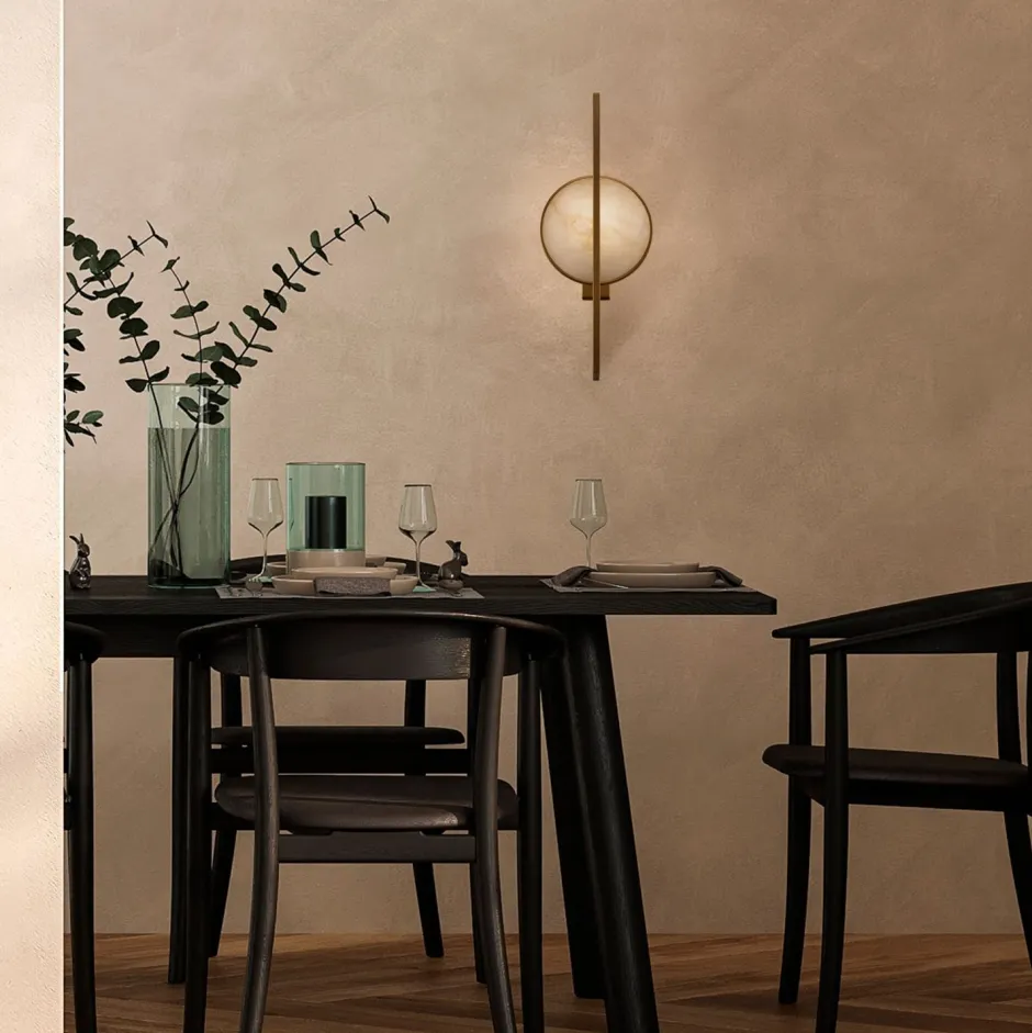 Die runde Blende aus natürlichem Stein verleiht der Wandleuchte einen außergewöhnlichen Charakter, der ideal in Wohnzimmer, Schlafzimmer und Flur passt