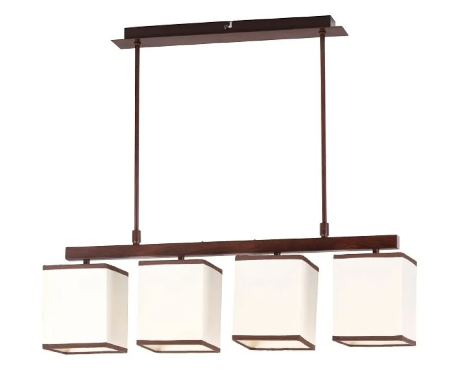 Unter der Familie Kubu versammeln sich edle Leuchten im Retro-Stil. Ihre Besonderheit besteht in den Lampenschirmen aus beigem Stoff, der oben und unten mit einem braunen Saum eingefasst ist und die Leuchtkörper so perfekt mit dem Gestell harmonieren lässt. Die warmen, erdigen Töne sorgen für eine gemütliche Lichtatmosphäre, und sorgen durch den Kontrast mit der metallenen Optik der Leuchtenbasis für interessante Effekte. Die Hängeleuchte verfügt über vier dieser Leuchtkörper, die geradlinig an einer Halterung in Holzoptik angebracht sind, so dass die Lampe kompakt und luftig zugleich wirkt. Die E-14 Fassungen sind dabei perfekt für die Aufnahme von Energiesparleuchtmitteln geeignet.