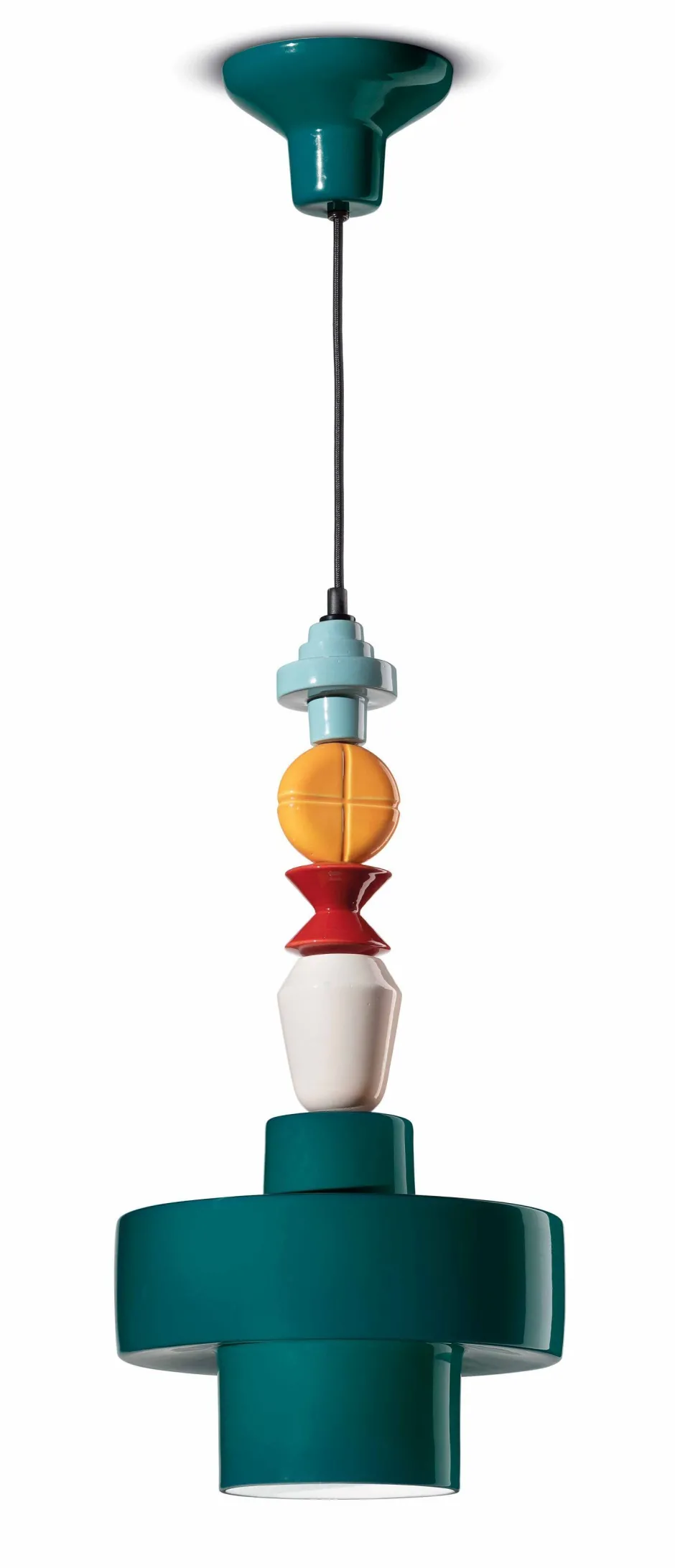 Die außergewöhnliche Form und die bunten Farben machen aus der Hängelampe einen absoluten Blickfang in Wohnzimmer, Esszimmer und Küche
