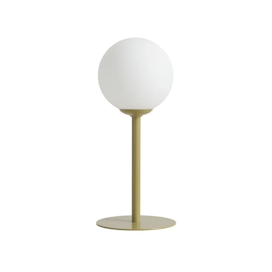 Moderne Tischleuchte aus Metall und Glas in Pistazie und Weiß