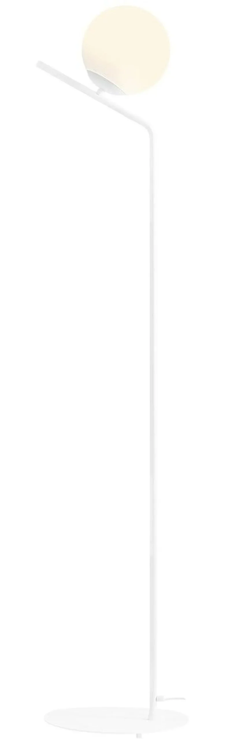 Der weiße Kugelschirm aus Glas streut das Licht blendarm – hervorragend für gemütliche Momente im Wohnzimmer als Leselicht oder Ambientebeleuchtung