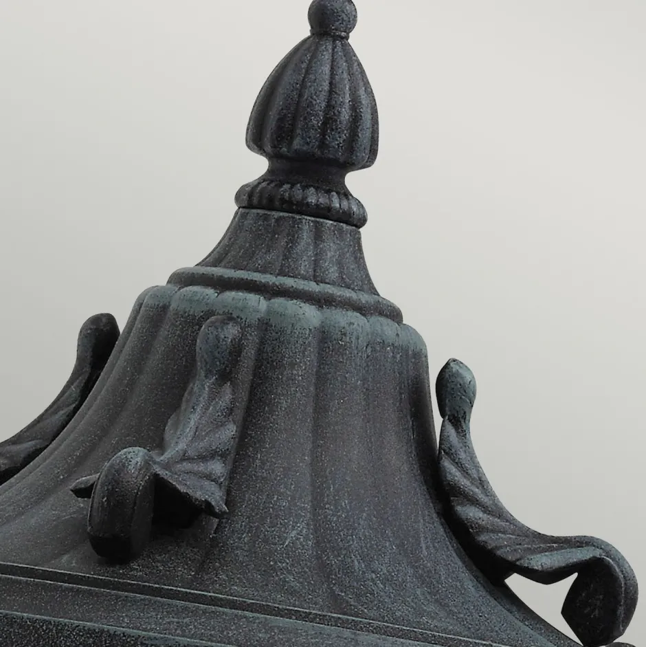 Die schwarze Farbe ist mit einer grüne Patina überzogen, was der Wandlampe einen antiken Vintage-Look verpasst – ein außergewöhnlicher Blickfang an jeder Fassade